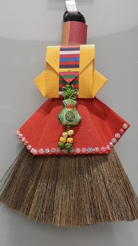 미니빗자루에다 복주머니 접은 것과 치마를 접어 예쁘게 꾸몄습니다.  아주 예쁩니다.