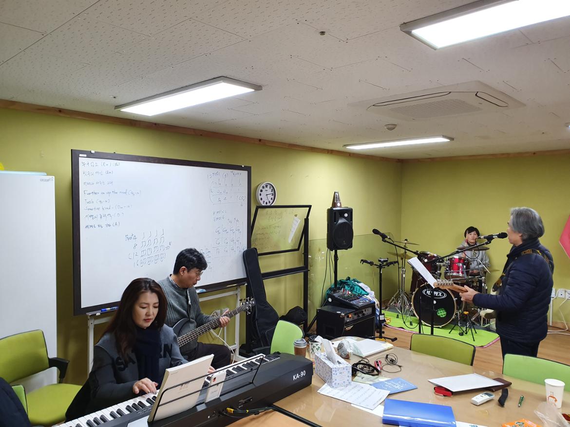 지난 시간에 배운 블루스리듬으로 여러가지 곡을 연습했습니다. 가요로는 "누구 없소", "빗속의 여인", "이별의 종착역"을 연습했습니다. 그리고 팝으로는 "Tush", "Further on up the Road", "Sensitive Kind"를 연주했습니다.
