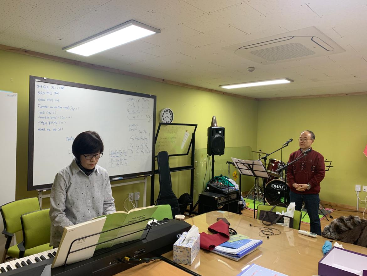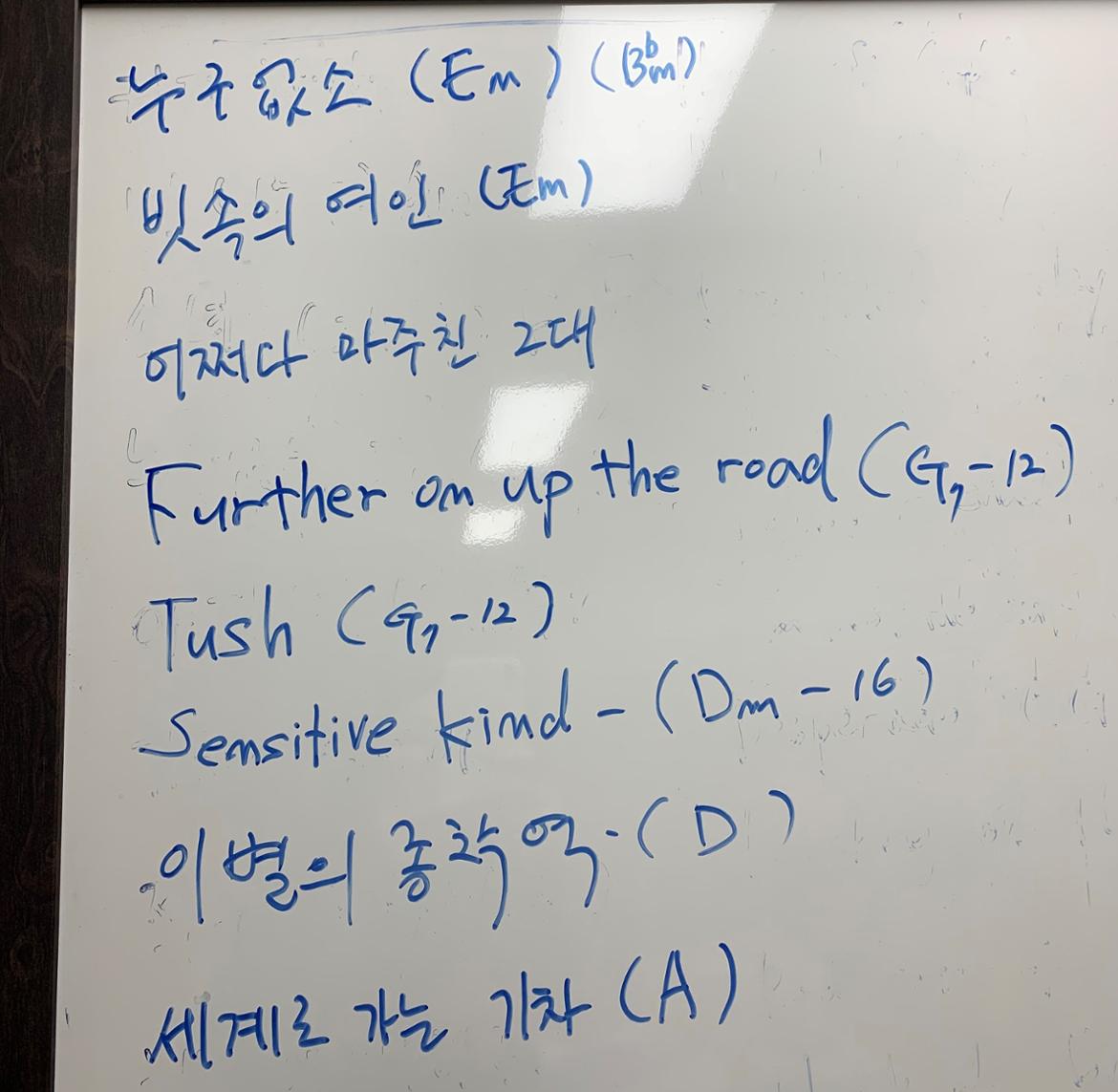 오늘 연습의 시작은 손준호님이 고른 가곡 '눈'으로 열었습니다. 눈이 별로 없었던 겨울이라 그런지 더욱 잔잔하게 와닿은 곡이었습니다. 요즘 연습하고 있는 곡들은 '누구없소', '빗속의 연인', '이별의 종착역'과 같은 블루스 기조의 가요와 'Further on up the Road', 'Sensitive Kind'와 같은 팝입니다. 게다가 '세계로 가는 기차'를 셔플로 연주하고 있습니다. 매우 신나네요!