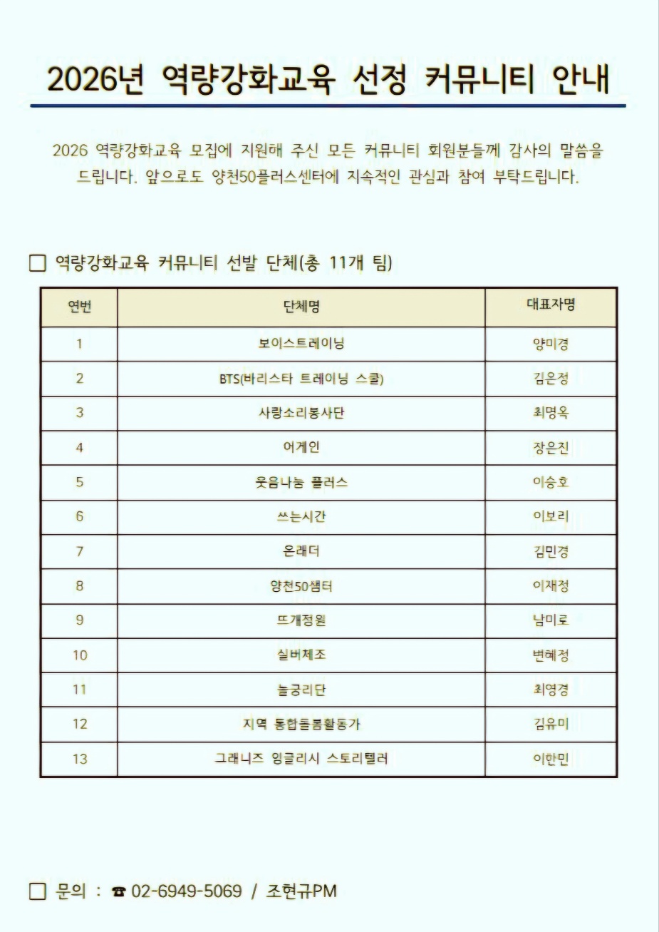 2026 양천 50+센터 역량강화교육 커뮤니티 선정결과 통보