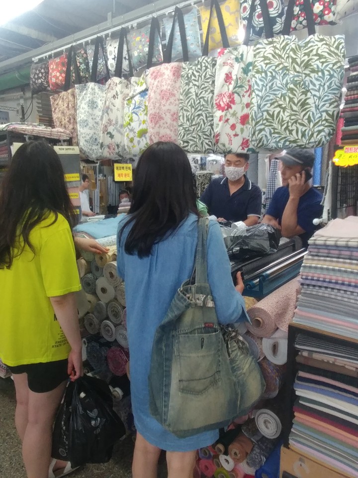 동대문 원단 시장은 늘 생동감이 넘치는 장소 입니다. 우리 환히찬의 밝은 에너지 뿜뿜 하시는 두분과 함께 하니 생동감 뿜뿜뿜~ 마스크 만들 예쁜 원단과 마스크 끈등을 구입하고 보니 마스크를 만들어 우리의 환경을 위한 실천을 함께 해주실 분들과 나눌 생각에 벌써 설레입니다. 환히찬 이멤버 포에버~