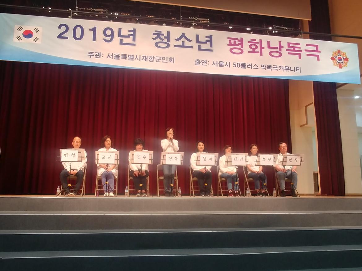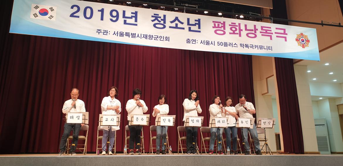 서부캠퍼스의 낭독커뮤니티인 '50+막독극'이 5월 10일 오후 2시부터 약 30분간 국립현충원의 현충관에서 <2019 청소년 평화낭독극> 공연을 펼쳤습니다. 200여명의 학생과 교사 그리고 재향군인회 관계자 10명은 낭독극 <너도 그렇다>를 진지하게 경청했습니다. 마지막에는 출연자와 관객이 하나되어 노래 "바람이 불어오는 곳"을 부르며 현충관에서의 공연을 성공적으로 마무리했습니다.