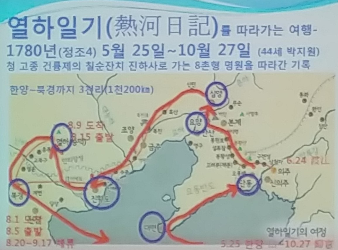 조선의 선비 박지원이 보수적이던 조선의 모습과는 판이한 별천지 청나라의 신문물과 규모에 감탄과 경이를 지닌 체 겪었던 경험의 '열하일기'