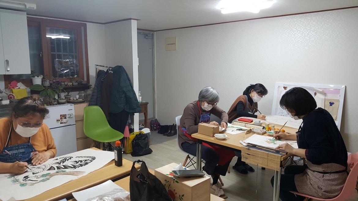 도자기와 민화의 융합 작업을 마치고 다시 민화 채색 작업을 시작했습니다.