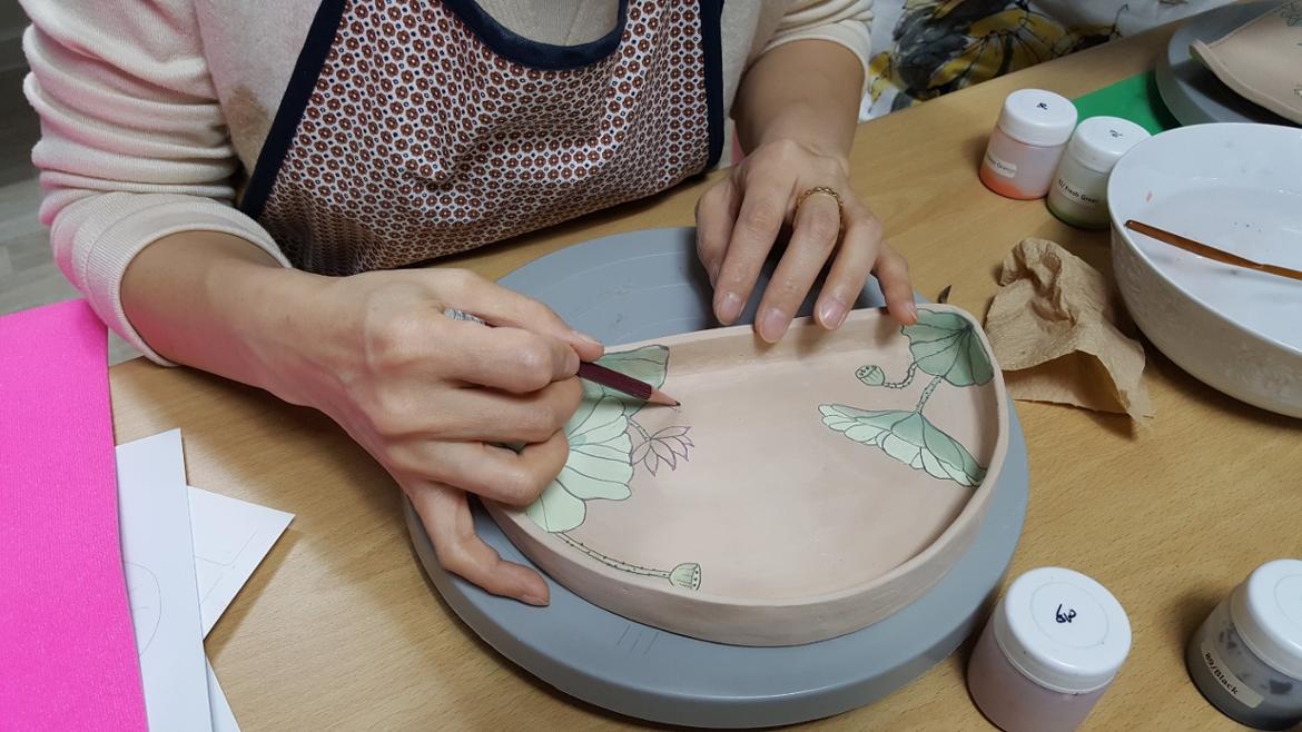 초벌구이 한 도자기에 연필로 그리고자 하는 대상을 스케치합니다.