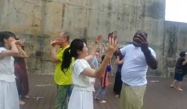 연구원들의 안내를 받아 점점 마음을 열고 참여하던 중, 하이라이트는 마더스 프레즌트라는 작품입니다. 머리에 옷이나 스카프를 이고 걷다 만나는 사람에게 감사의 인사를 합니다. 문명의 주고 받음. 용서의 마음으로 인사를 하고 스카프를 떨어뜨리면 두 손으로 공손히 받아 자신의 머리 위로 올려 다시 자기 길을 가고. 또 다른 사람 만났을 때 또 반복하는 작업인데요, 사랑하고 용서하는 마음으로 인사를 주고받으며 모두 하나됨을 경험합니다. 걷기춤에서 어린 아이들이 머리 위에 양말을 얹고 하면서 아이들 양말이 어른들 머리 위에 돌아가면서 얹어졌습니다. 함께 춤추는 사이에 모두 아름다운 하나가 되었습니다.