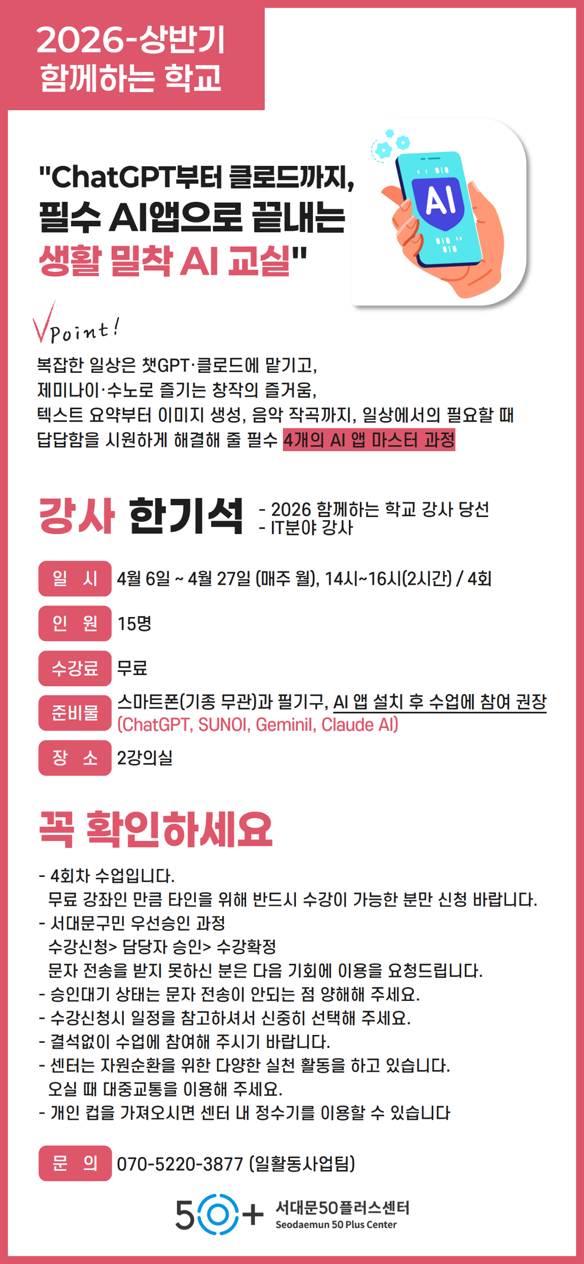 [서대문][함께하는 학교]ChatGPT부터 클로드까지, 필수 AI앱으로 끝내는 생활 밀착 AI 교실마감 D-34