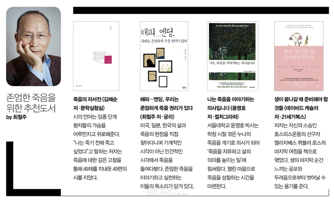 백세시대, ‘얼마만큼 살 것인가’보다 ‘어떻게 살 것인가’에 가치를 두는 이가 많아졌다. 언론인 최철주(崔喆周·75)는 여기서 한 걸음 더 나아가 ‘어떻게 죽음을 맞이할 것인가’에 대한 고민이 필요하다고 말한다. 그는 장수시대라는 착각에 빠져 우리의 삶이 더욱 오만하고 지루해지는 것을 경계한다. ‘웰빙’을 위한 ‘웰다잉’을 이야기하는 그의 생각을 <존엄한 죽음>에 담았다.