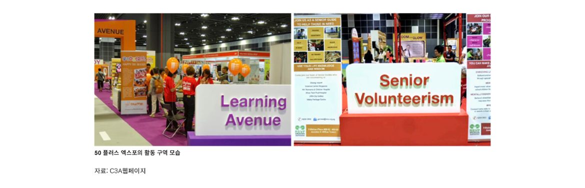 이 외에도 C3A는 다양한 활동을 전개하고 있다. 예술 (전시회, 중국화 수업, 중국 서예, 기초 회화), IT수업 (기초 컴퓨터, 아이패드, e-엔터테인먼트), 재정 (유산, 투자 가이드), 건강 (요가, 치매 예방 교실), 요리 교실, 50 플러스 엑스포 등 다양한 활동을 전개하고 있는데, 50+세대를 대상으로 개최되는 엑스포에 대하여 자세히 소개하고자 한다. 싱가포르에서는 C3A가 주관하는 50플러스 EXPO가 개최되고 있다. 50 플러스 엑스포는 싱가포르의 고령자와 베이비 붐 세대를 위한 박람회로는 싱가포르에서 규모가 가장 큰 종합적인 이벤트로, 모든 이벤트가 무료로 진행된다. 2011년에는 <50플러스엑스포2011>42일에 개최되었는데, 당시 홍보 문구는 다음과 같았다. “쇼핑할 때가 아닙니다. 다양한 전시회에 대해 궁금하고, 또 그 궁금증을 해소하고 싶은 엄마들은 50플러스엑스포 2011로 향하세요!”