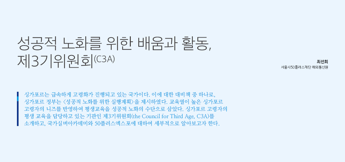 싱가포르 정부는 고령사회 대비를 위하여 다양한 정책과 실행계획(action plan)을 제시하고 있는데, 가장 대표적으로 성공적 노화를 위한 실행계획(The Action Plan for Successful Ageing)”을 들 수 있다. 이 계획은 제목 그대로 싱가포르 국민들이 성공적으로 나이를 들 수 있도록 하기 위한 실행 계획으로, 다양한 주제를 다루고 있는데 평생교육이 그 중 하나이다. 본고에서는 싱가포르 고령자의 평생 교육을 담당하고 있는 기관인 제3기위원회(the Council for Third Age, C3A)를 소개하고, 구체적인 프로그램으로 국가실버아카데미(National Silver Academy, NSA)50플러스엑스포(Expo)에 대하여 알아보고자 한다.