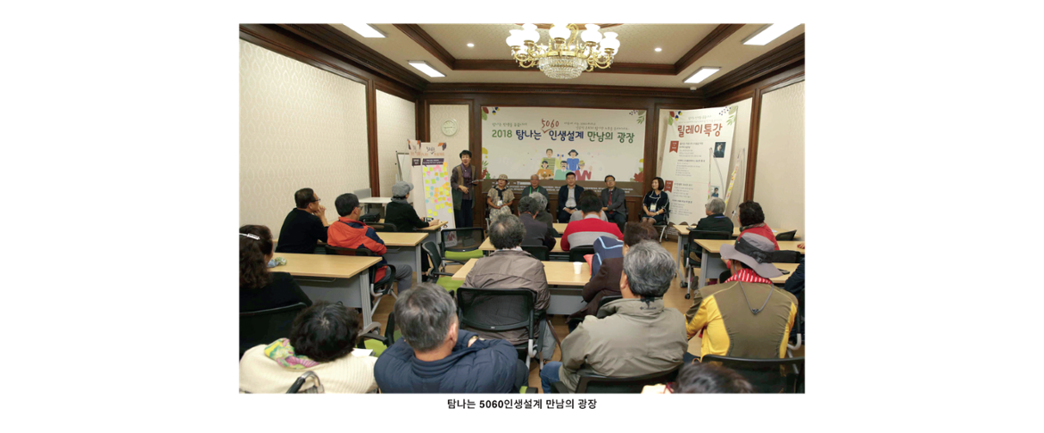 ‘탐나는 5060프로젝트’는 우리나라를 이끌어 온 베이비부머들이 은퇴 후에도 그들의 축적된 경험과 재능이 지역사회에 활용될 수 있도록 추진되고 있는 사업이다. ‘탐나는 5060인생설계 만남의 광장’은 참여자들의 발표 및 공연, 전문가들의 특강과 토크 콘서트, 실질적인 노후 준비를 위한 상담, 일과 사회참여 활동 정보까지 한자리에서 one stop으로 제공되었다. 토크콘서트는 ‘나이듦에 대하여’란 주제로 이완국 대표(행복한 쉼터)와 노후설계 관련 전문가 2인, 탐나는 5060인생학교 1~3기 각 대표 1인이 참여했다. 5060세대가 직접적으로 느끼는 노후 인생설계에 대한 의견 수렴과 현황을 알아보기 위해 배너WALL를 만들어, 50세 이후의 어떤 삶을 살고 싶으며 무엇을 준비하고 있는지, 무엇이 필요할지 소통하는 자리가 이어졌다. 이어서 ‘활기찬 커뮤니티 조성을 위한 Active aging’을 주제로 한동희 소장(노인생활과학연구소)의 강연과 ‘내 인생의 자서전 쓰기’란 주제로 박범준 편집장(기억의 책 꿈틀)의 강연이 진행되었다. 탐나는 5060인생학교를 수료하고 이번 만남의 광장에서 오프닝 공연에 발표한 한 참여자는 “베이비부머세대들에게 사회적 변화를 체감하고 앞으로 남은 인생에 실제 필요한 배움의 기회와 다양한 사회공헌 활동 기회가 꼭 마련되어야 한다”고 강조하였다.