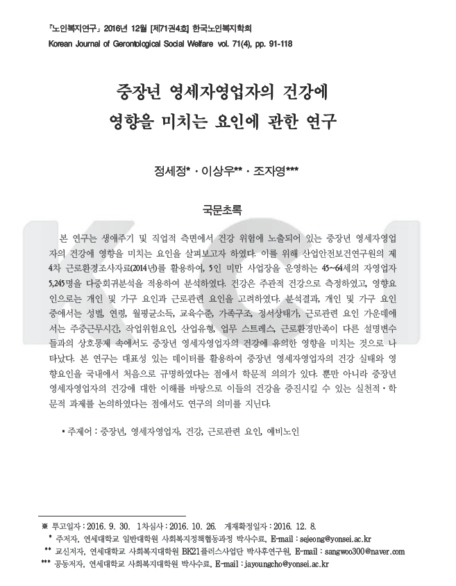 • 이 글은 생애주기 및 직업적 측면에서 건강 위험에 노출되어 있는 중장년 영세자영업자의 건강에 영향을 미치는 요인을 살펴봄.